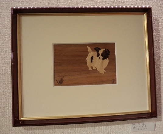 本当に、たくさんの作家さんの、たくさんの小さい作品を楽しんでいたところ、かわいい子犬の作品が目にとまりました。子犬の背景には木目が見えるようです。箱根の寄木細工を連想しましたが、それにしても、この作品はどんな手法で作られているのでしょうか?