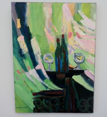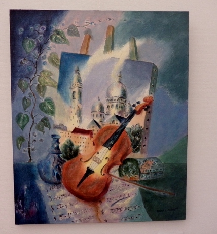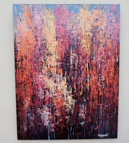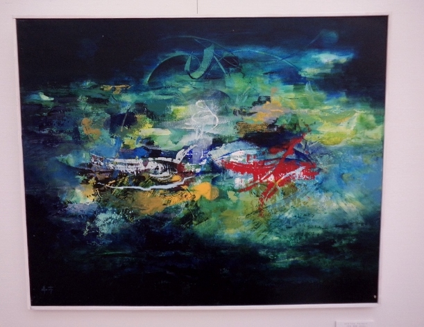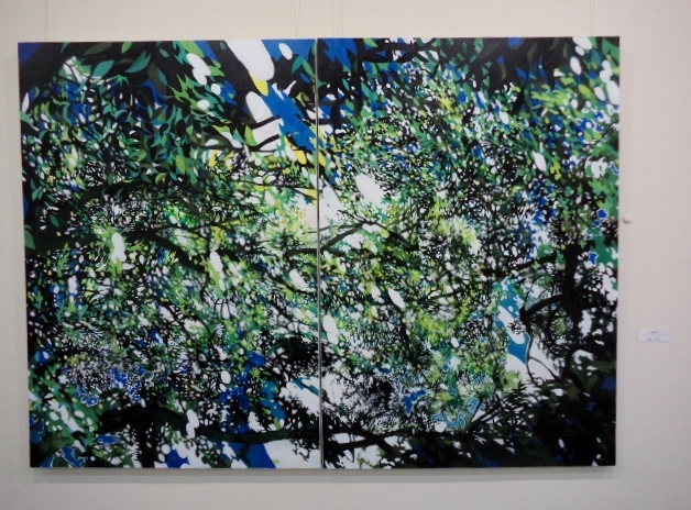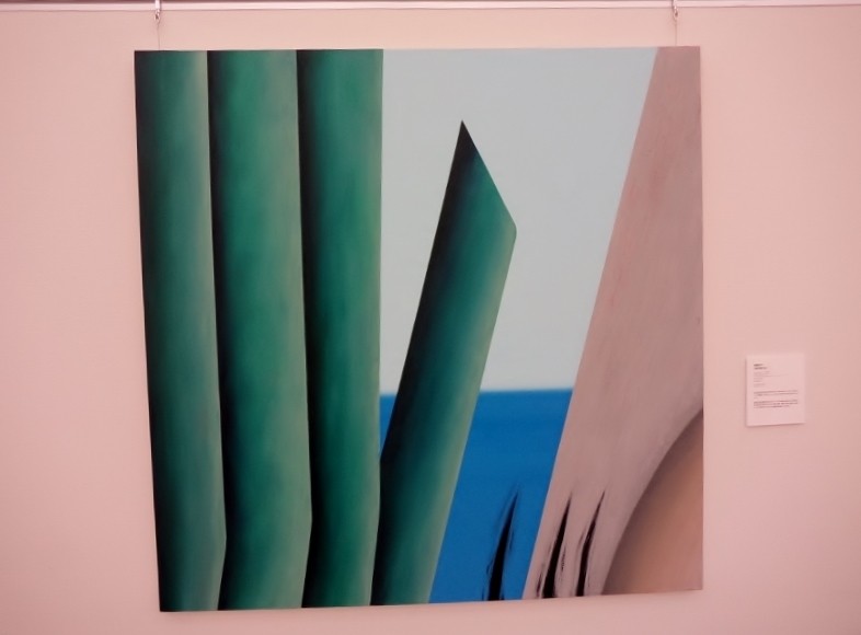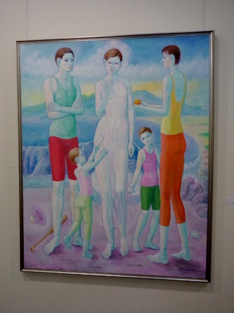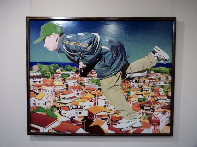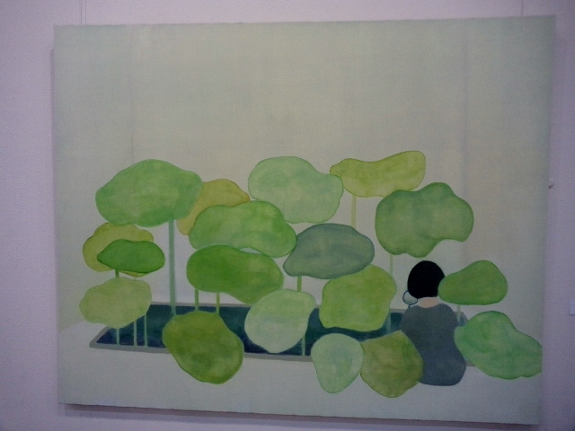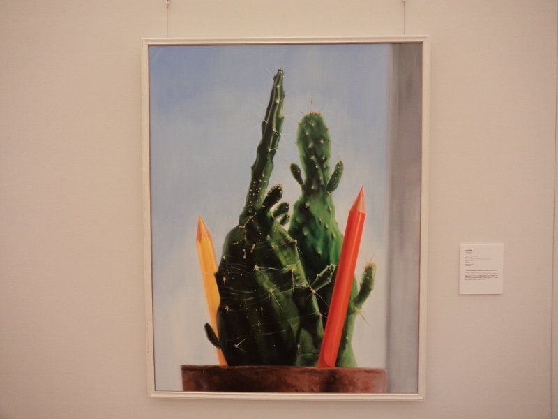 渡部未乃さん「海が見える」は、画面の左側に緑色の植物らしいもの、画面の右側にピンク色のオブジェクト、で大半を占めているというシンプルな構成なのですが、なぜだか、残りのわずかなスペースに描かれた、遠景の海と空の青さに、広々とした心地よさを感じました。そういえば、渡部さんの作品は、今年4月にチャームスイート京王聖蹟桜ケ丘のアートギャラリーホームオープニング前の見学会でも拝見しましたが、やはり遠景に海が見える風景がモチーフでした。