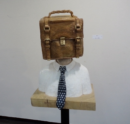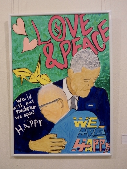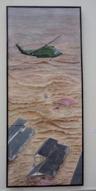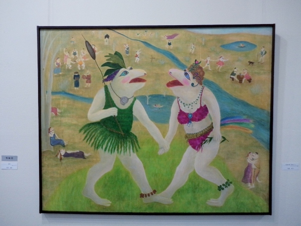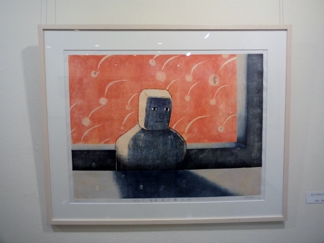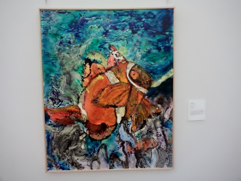 水上卓哉さん「ともに生きる」には、大きく目を見開いた、オレンジ色の魚が描かれています。生きるものの存在感が圧倒的な迫力で描かれているようです。なぜだか、最近国立博物館で見たばかりの白隠禅師のだるまの絵を思い出しました。心の中に住む、容易ならざる生き物と、「ともに生きる」覚悟のようなものを感じました。