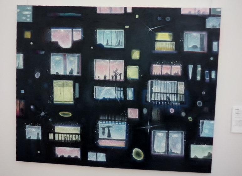 折笠晴美さん「-光の戯れ-(マンション)」は、夜のマンションの窓の様子が描かれています。いろいろな色が漏れている窓からは、それぞれの部屋にそれぞれの生活があることを感じさせてくれます。そういえば、FACE展2016で拝見した、中山紘樹さんの作品を思い出しました。同じように団地の窓というモチーフは似ていても、受ける印象はずいぶん違いますね。