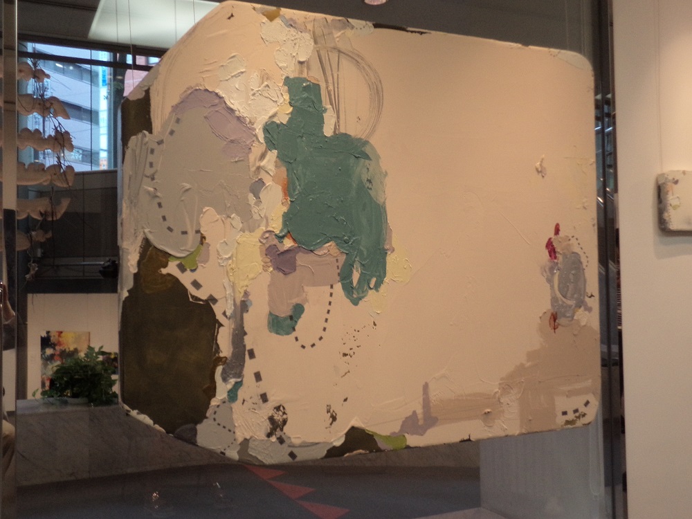 タシロさんご本人の説明の後、この絵のモチーフについてお尋ねしてみました。最初のころは古びた靴やバッグなどをモチーフにして描いていたのですが、だんだんと抽象化されていって、具体的な物ではなくなっていったのだそうです。とはいえ、抽象化された後も、依然として使い古されたものへの愛着を表現したいという気持ちは変わらないそうで、タイトルの”relationship”には、持ち主と物との関係、という意味もあるそうです。作品の厚みは物の存在感や物質感を強調するのに役立っているようです。鮮やかな原色ではなく、中間色を使っているのもそのため。角が丸くなっているのも、使っているうちに、だんだんと丸みを帯びてくる様子を表現したいのだそうです。