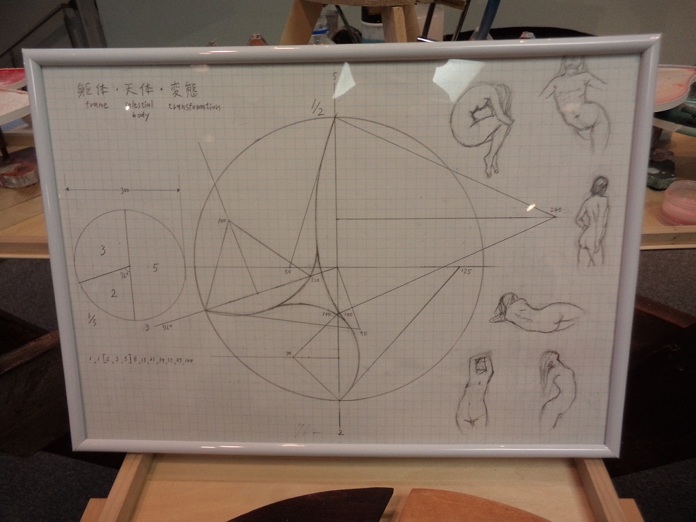 その横には設計図のようなものがありました。かなり精密に計算されているようですが、元となっているのはフィボナッチ数列 だとのこと。考えようによっては、数学も抽象表現の一形態といえるのかもしれません。そしてその横には、何故だか裸婦のスケッチがいくつか…。この曲線の形は裸婦のイメージでもあるそうです。わかったような、わからないような…。できあがった作品もさることながら、制作のプロセスや道具のほうもかなり面白いですね。