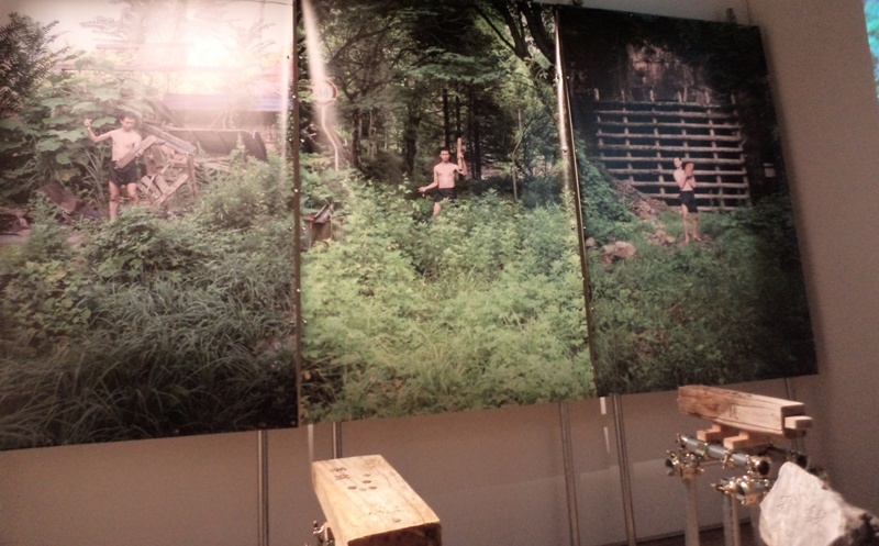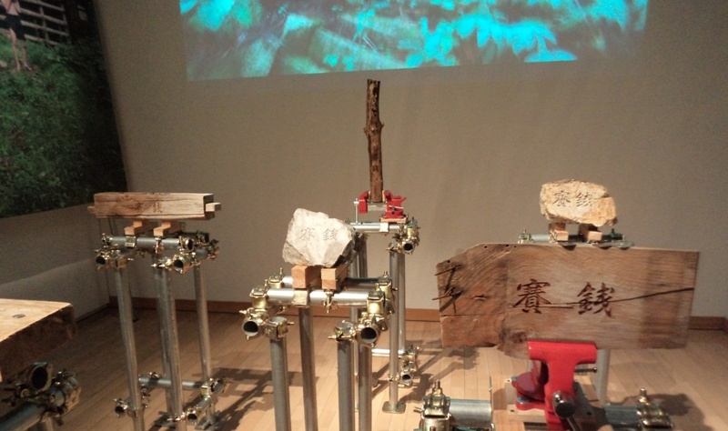素材は、廃村となった集落の神社周辺などから集めてきた板や石などのようです。横の壁には、ご自身が上半身裸になって、山の中で見つけた作品の素材を手にしているらしい写真が展示されていました。