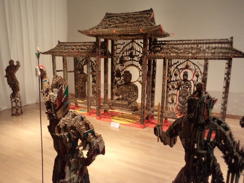 お金がなくてもアートはできる、という心意気を示すような作品もありました。捨てられていた段ボール紙で、仏様と十二神将の像を作られた、二重の意味で、お見事な作品です。