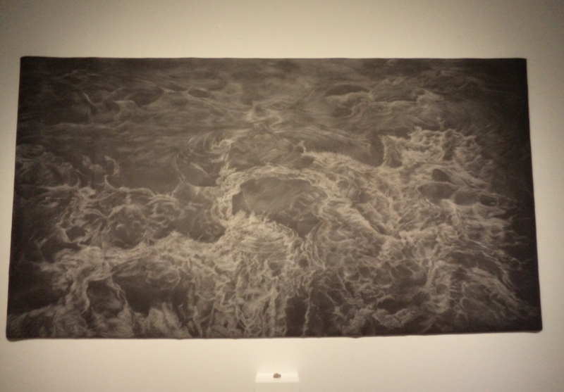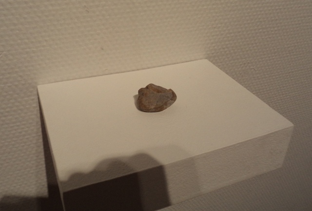 こちらの作品も素材には、極力お金をかけていなさそうな、サンドペーパーの表面に、小石を使って絵描かれた作品です。作品の手前には、実際に制作に使ったという小石も展示されていました。
