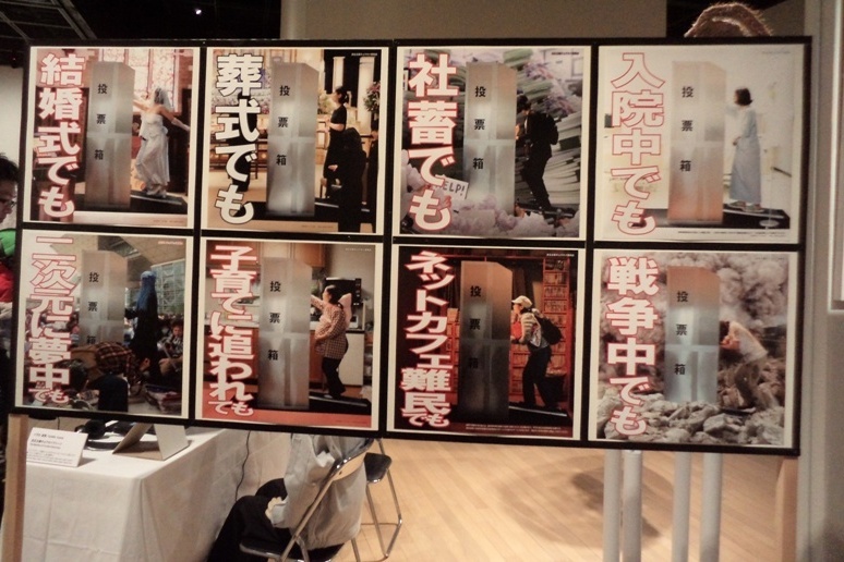 このポスターの裏側には、投票所があって、作者のイガわさんから投票の仕方をていねいに教えていただきました。歩きながら、次々にスクリーンに表示される質問に対して、短い時間のうちに「賛成」「反対」どちらかに丸をつけなければならない、という体験型の作品です。もたもたしていたら、回答を記入する前に、横からどんどん投票用紙を取られてしまいました。歩きながらだととても考えられないでしょ、ややこしい質問に対して「賛成」「反対」の二者択一などではとても答えられないでしょ、という選挙制度の抱える矛盾を、身をもって体験させていただきました。ちなみに、このややこしい機械の制作にはご主人が協力してくださったそうです。