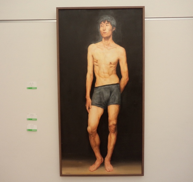 ところが、奥の小部屋に入ってみると、ご自身のお母さんを描かれたという、こんな絵も展示されていました。広いショッピングセンターを歩き疲れた足を、椅子に座って休ませているところなのだそうです。目が悪いとのことで、本を離して読んでいるのだそうです。それは、私も同じなのでよくわかります。さきほどの絵がよそ行き顔だとすると、こちらは日常を描いた普段着の絵なので、それでまた、なんだかホッと肩の力が抜けました。しかしながら、これこそが現代では「聖母像」なのかも知れないと、ふとそんな気もしました。