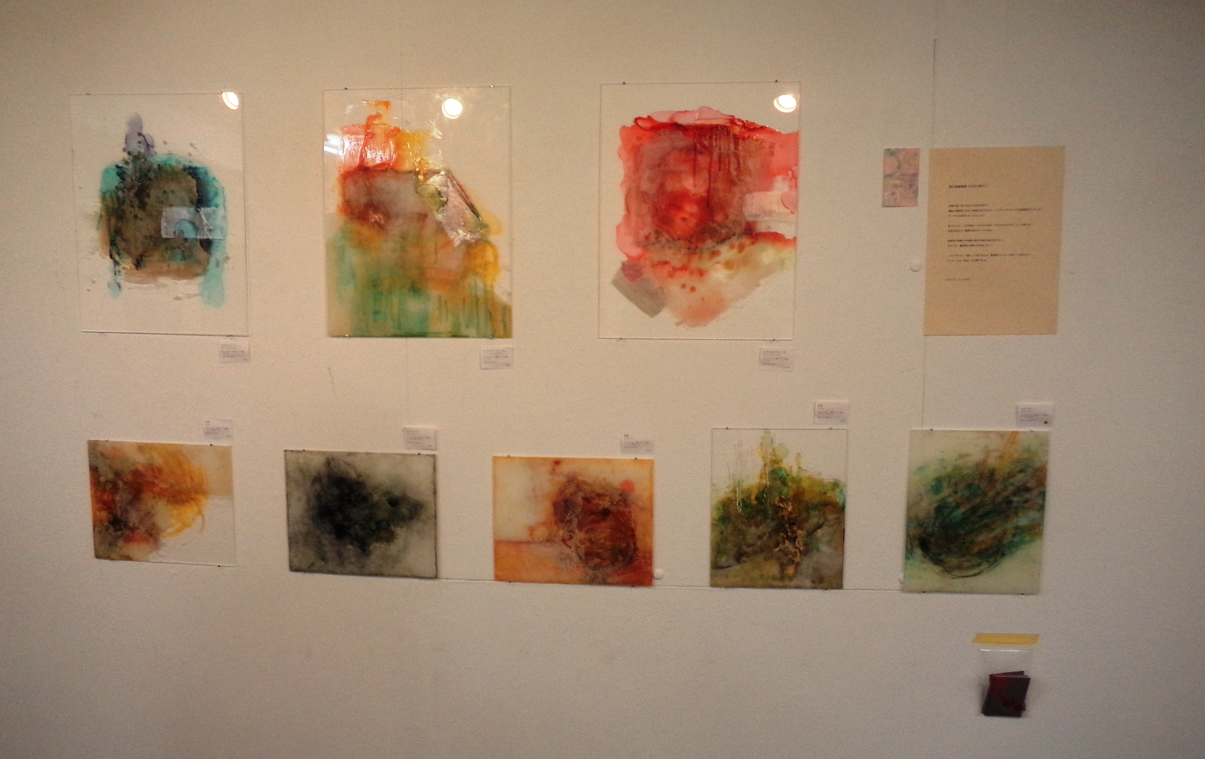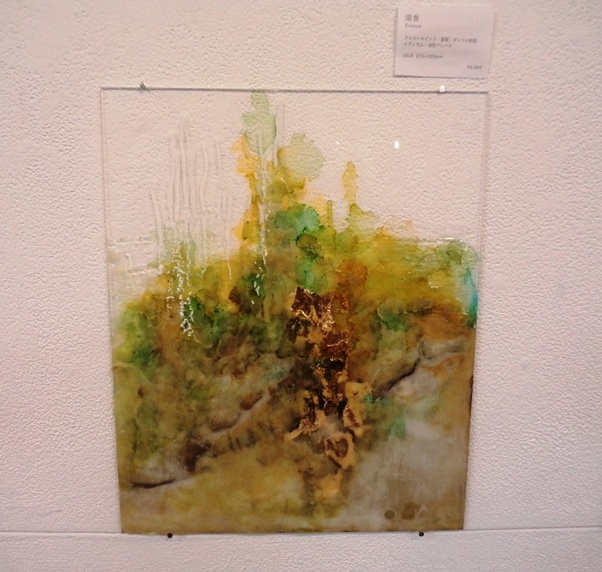ヘンミモリさんの作品は、他の作家さんの作品とは異なって、透明な板に描かれています。透明なアクリル板の上に、アルコールインクや蜜蝋を使って描いているそうです。色は鮮やかなのですが、いったい何が描かれているのか、判然としません。抽象画なのだから、当たり前かもしれません。一応、モチーフが何かあるのかお聞きしてみましたが、特にないそうです。描き始めるときに、何かイメージがあるのかお聞きしましたが、これも特にないとのこと。弱ったなアと思っていたら、「でも描いているうちに、ちょっと、実家の庭に似ているかなあ、とか思うことはあります。けっこう庭が好きなんです。」と、助け舟をだしてくださいました。宮城県石巻市のご実家には、けっこう広い庭があるそうで、その庭が好きだったそうです。